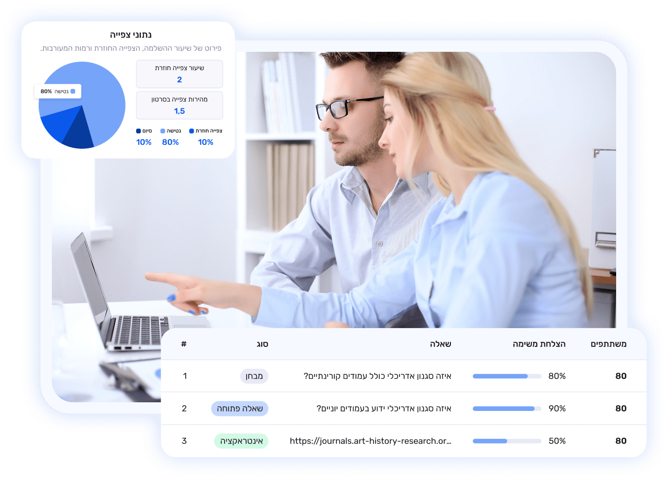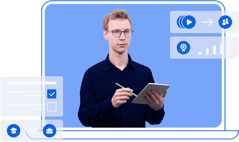 המערכת  מעניקה לארגון תמונה מלאה וברורה על התקדמות הלמידה ותיעוד השתתפות בהדרכות לעובדים, הן ברמה האישית והן ברמה הקבוצתית. תוכלו לעקוב בקלות אחר צפיות בשיעורים, ציונים במבחנים, אחוזי השלמת משימות וקצב ההתקדמות בכל שלב בתהליך.