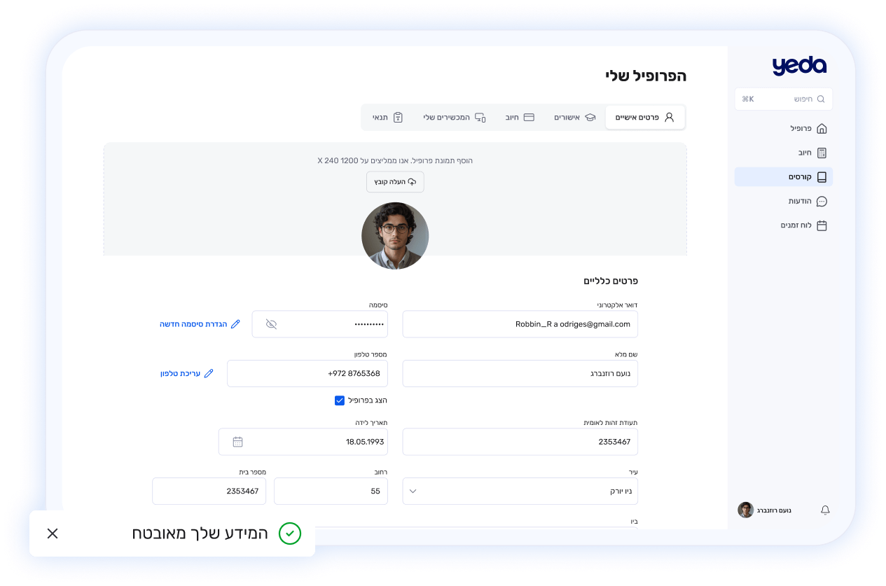 המידע הארגוני היקר והתכנים של הדרכות לעובדים, הכשרות וביצועים, מוגנים במערכת YEDA בשכבות אבטחה השומרות עליהם באופן הרמטי. השקענו בטכנולוגיות הכוללות אימות דו שלבי באמצעות SMS או דוא"ל כמו כן, כל הקבצים, הסרטונים והחומרים המקצועיים מוצפנים ומוגנים מפני העתקה או שימוש לא מורשה, בהתאם לפרוטוקולים ולתקני אבטחת מידע מחמירים.