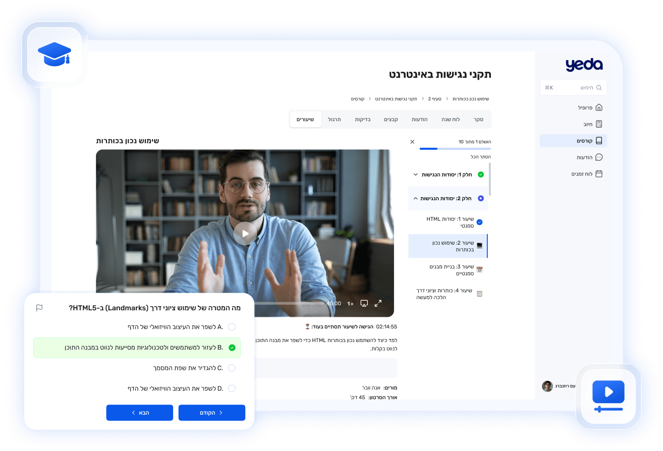 בתור מערכת LMS מובילה בתחומה, הפלטפורמה של YEDA מאפשרת יצירת מערכת ניהול הדרכות דיגיטלית, אחידה, מבוקרת ליעדי הארגון. המערכת מציעה ניהול גמיש ומלא של תוכני הדרכה, בכל פורמט ובכל סגנון למידה: שיעורים מוקלטים, סדנאות פרונטליות, onboarding לעובדים חדשים, הדרכות עובדים ותיקים או הדרכת מנהלים חדשים, מטלות, שאלונים וסוגים רבים נוספים.