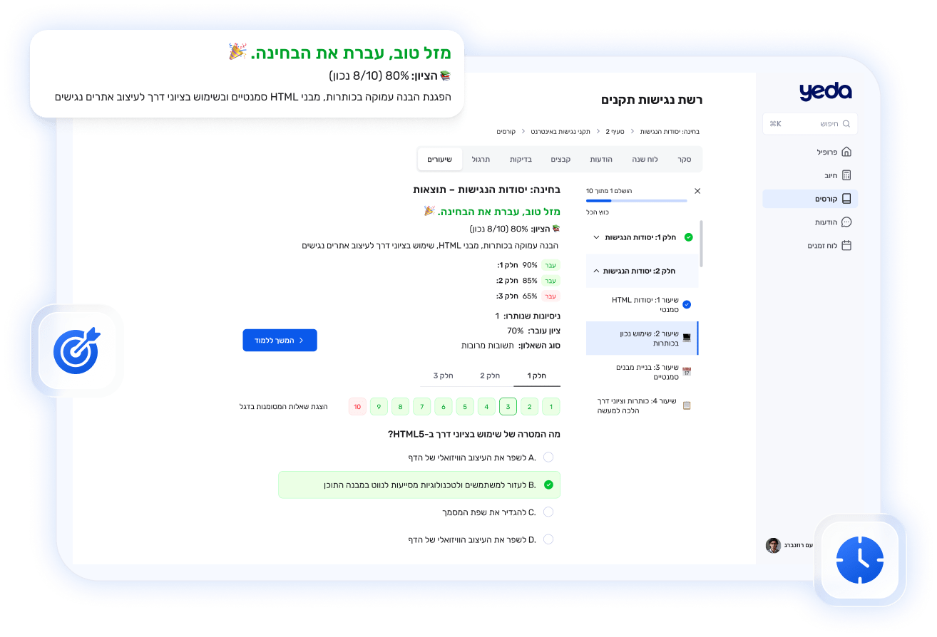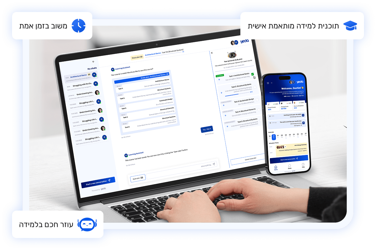 בעזרת YEDA, מנהלי הדרכה ו-HR יכולים ליצור חומרי הדרכות ולבנות מערכי הכשרות, לשתף לעובדים ולמדוד הצלחה בקלות. פתרון מלא להדרכות פנים וחוץ שמחבר בין אנשים, תוכן ובינה מלאכותית.