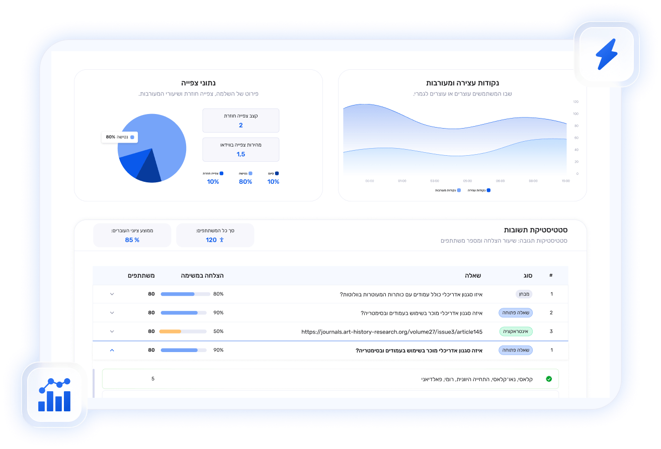 במשך שנים אנו חוקרים דפוסי למידה, חוויית משתמש והטמעת טכנולוגיות חכמות במערכות ניהול ידע. כל פיתוח שלנו נשען על נתונים אמיתיים: ניתוח תוצאות, מעקב אחר אינטראקציות, זיהוי נקודות קושי וחילוץ תובנות שמסייעות לשפר את תהליכי ההוראה וההבנה.
