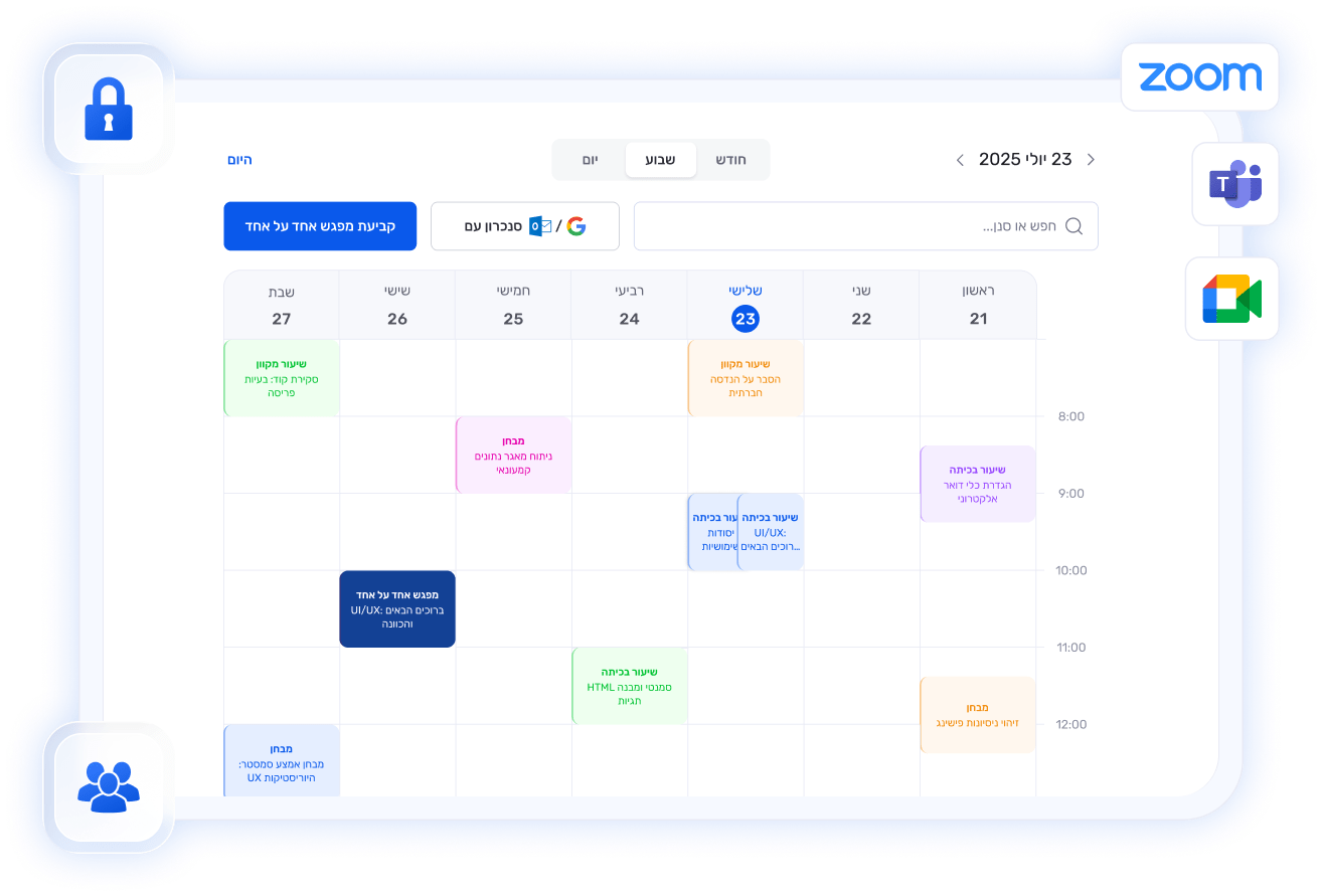 מערכת ניהול למידה מלאה (LMS) המאפשרת ליצור מסלולי לימוד מדויקים, לנהל יומנים חכמים, לחלק משתמשים לקבוצות ולתת הרשאות גישה מותאמות. ניהול הנוכחות מתבצע ידנית או באופן אוטומטי באמצעות חיבור ישיר לפלטפורמות כמו Zoom, Teams ו-Google Meet.