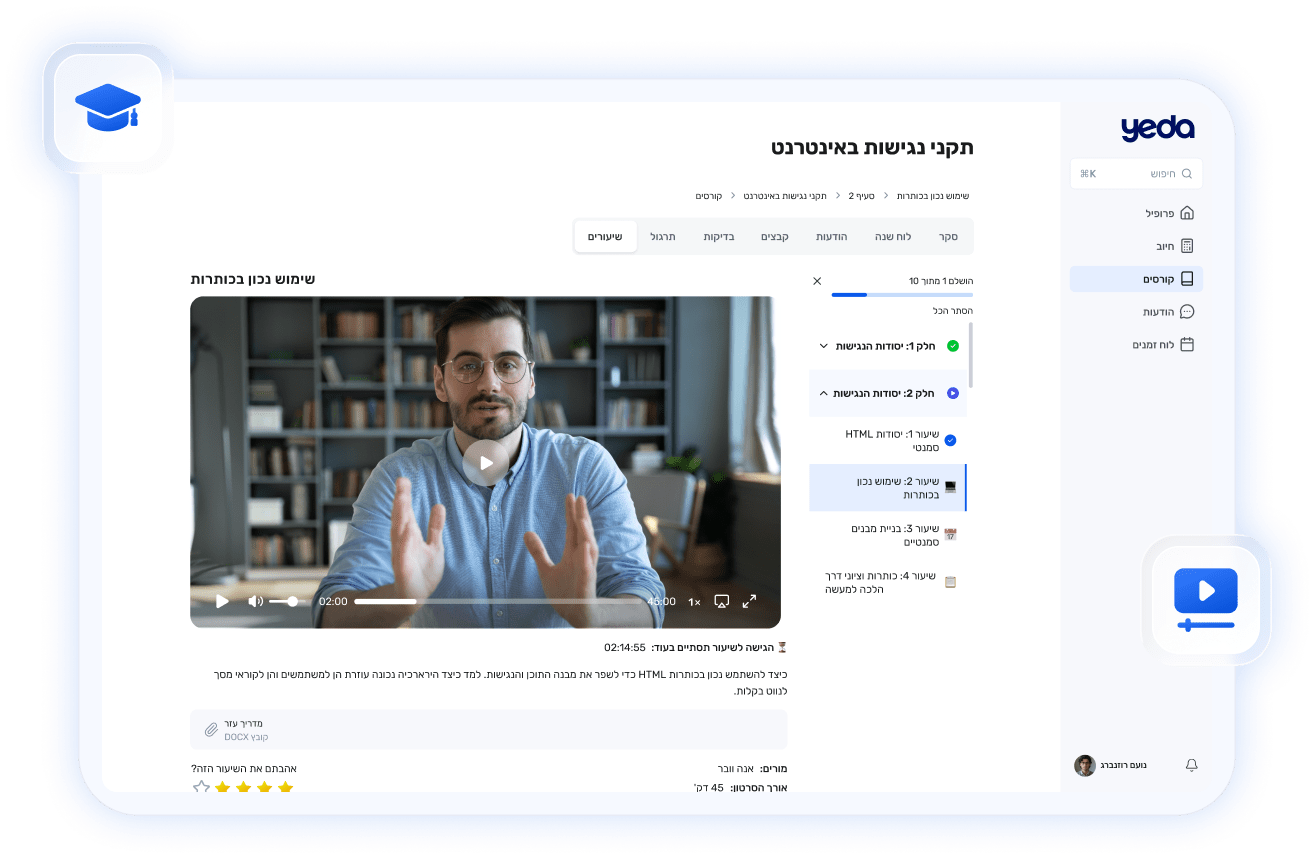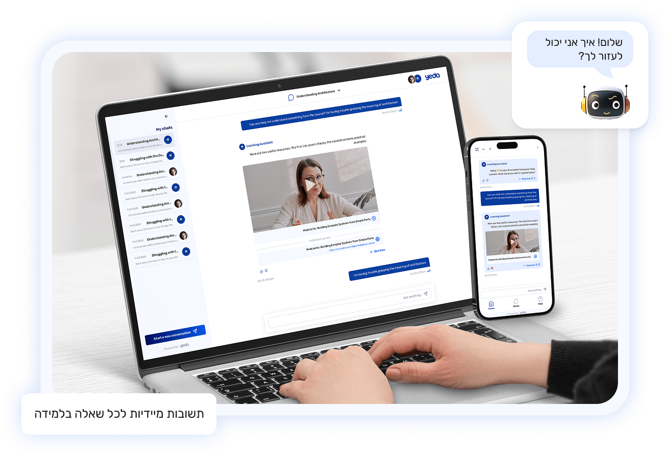 העוזר האישי החכם של YEDA מוטמע בכל שיעור או הדרכה ומבוסס על החומרים המקצועיים שהוזמנו למערכת, מסמכים, סרטונים ועוד.