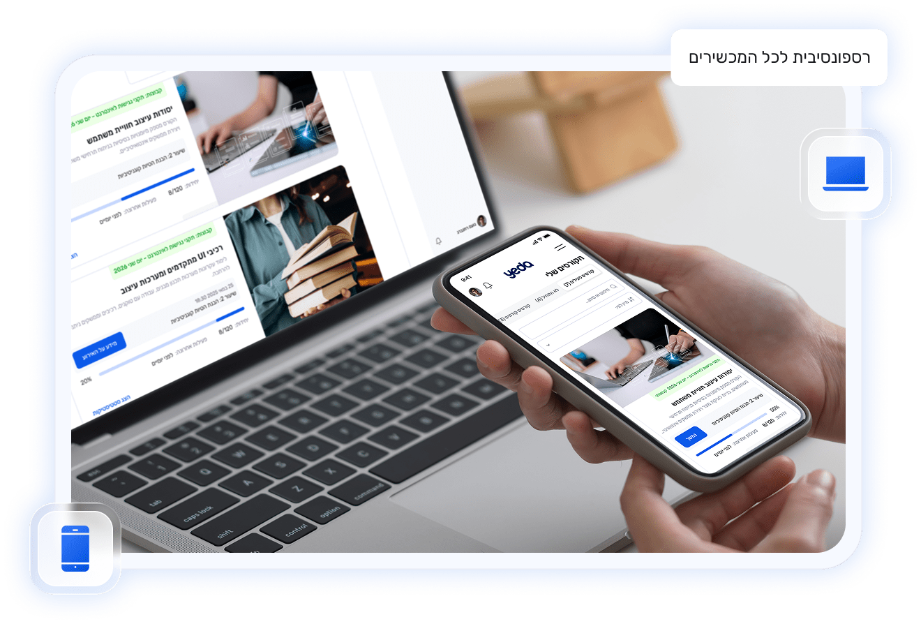 מערכת YEDA רספונסיבית ומתאימה לכל המכשירים החכמים וכל סוגי המסכים. ממשק ההעלאה והסידור של התכנים ידידותי ופשוט לתפעול, ובצד המשתמשים מתכתב עם השפה המיתוגית הקיימת של המכללה או הארגון.